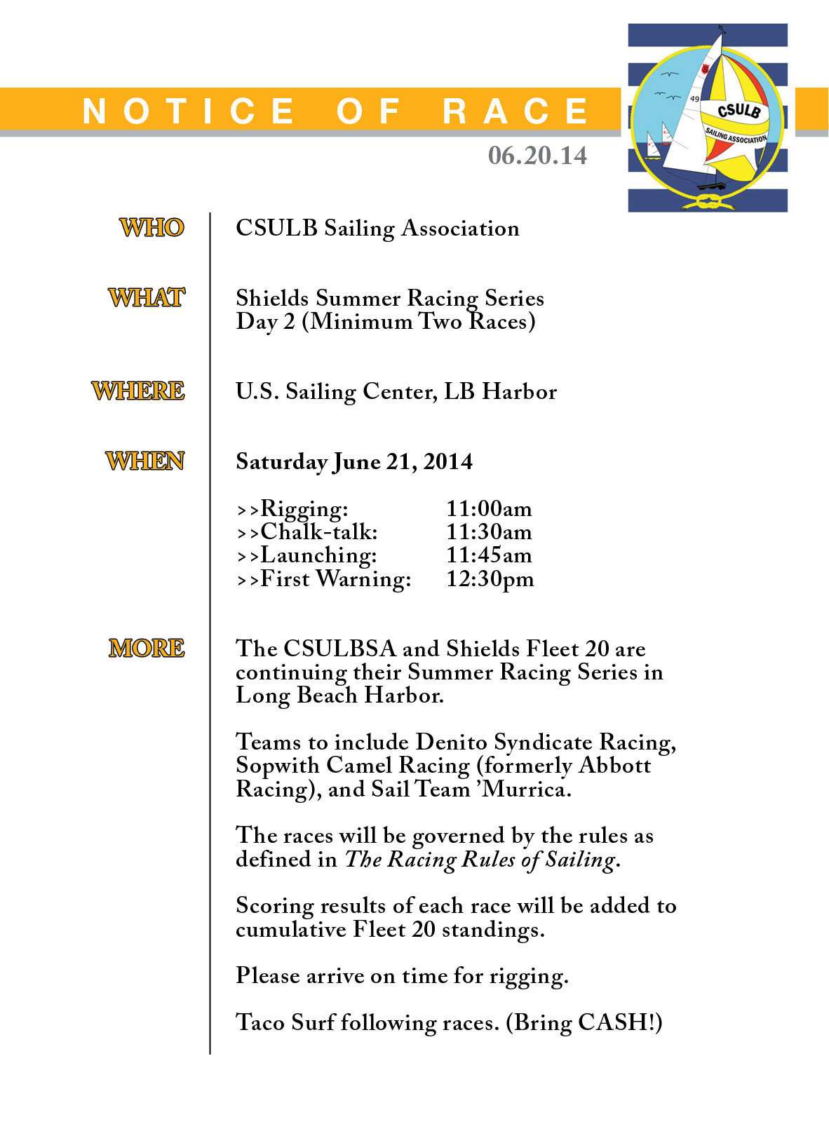 The Shields Summer Racing Series continues on Saturday June 21st at 11:00am as Shields Fleet 20 takes to the waters of Long Beach Harbor to continue their struggle for CSULBSA supremacy.