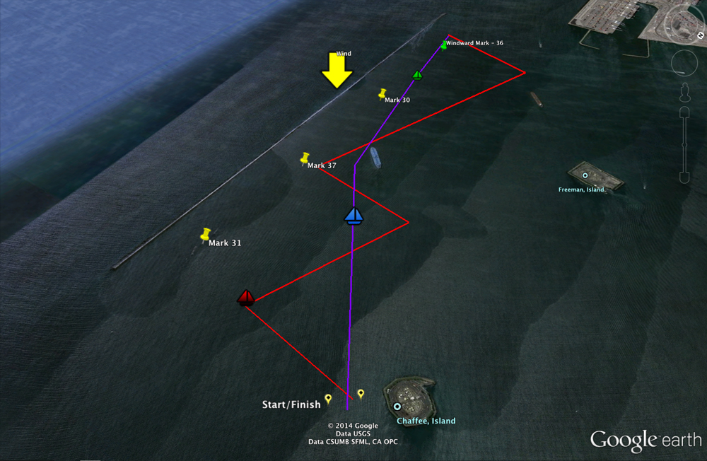 Race One was a quick windward/leeward race of 1.75 miles, with spinnakers. But after DSR damaged their only spinnaker, Race Two and Three took the boats on 2 laps, for about 3.5 miles roundtrip. (Click here to see the course map.)