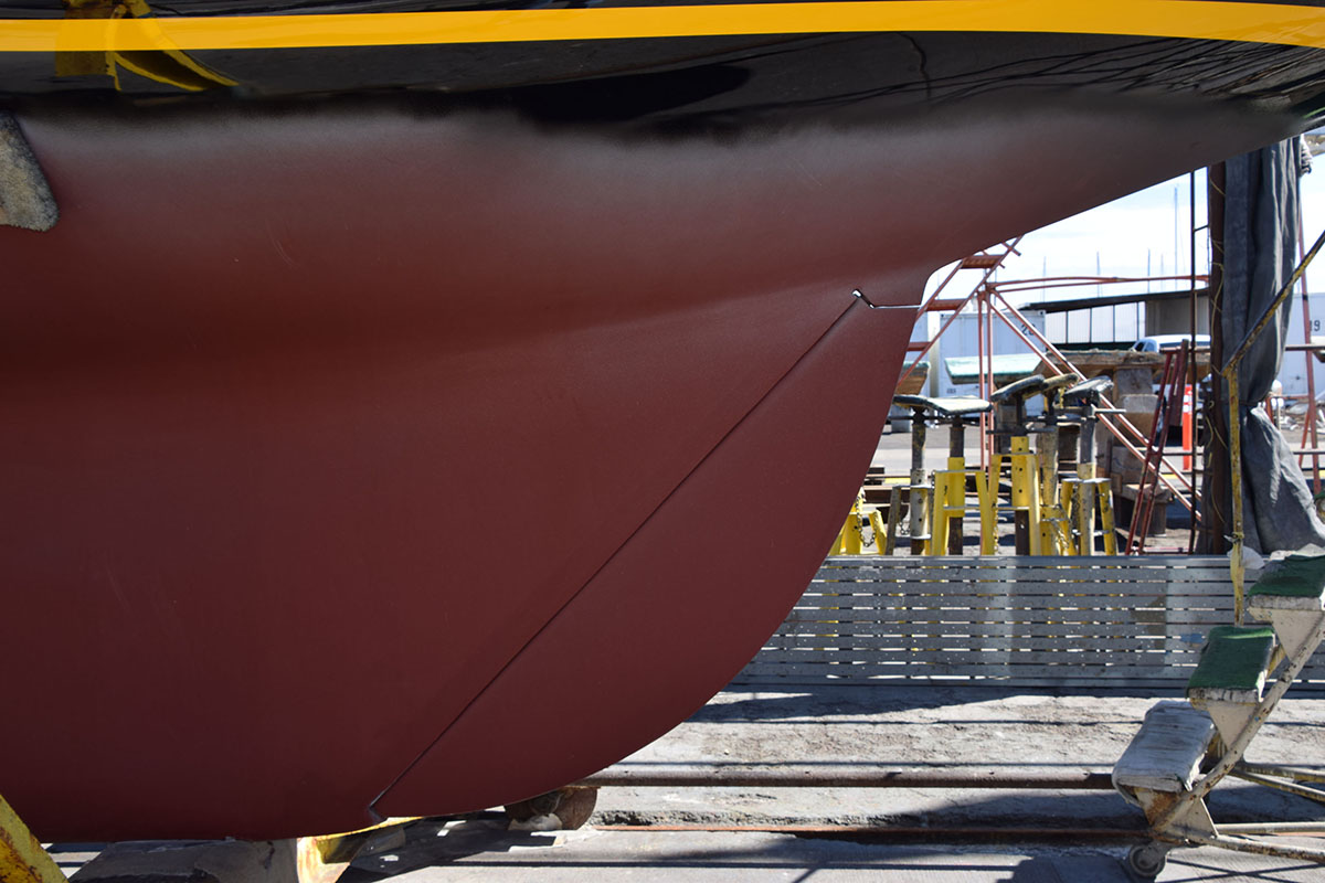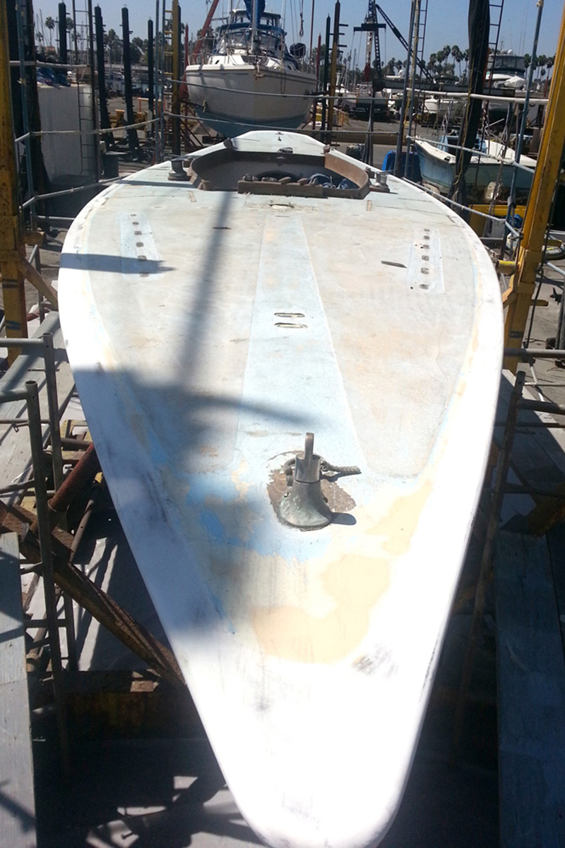 The CSULBSA has begun restoring one of its two original Shields. Beginning in August, “Josephine” (hull number 131) was moved from her storage space in the Marine Stadium yard to Marina Shipyard in Long Beach. There, she underwent keel and hull work along with a complete paint job and cockpit glassing.